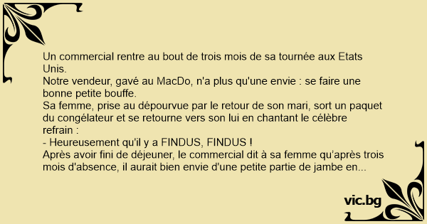 Après avoir fini de déjeuner, le commercial dit à sa femme qu’après trois mois d'absence, il aurait bien envie d'une petite partie de jambe en l'air.