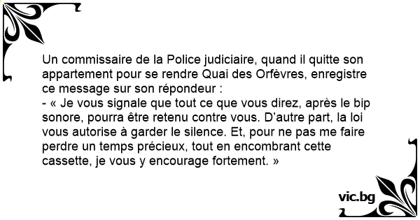 - « Je vous signale que tout ce que vous direz, après le bip sonore, pourra être retenu contre vous. D’autre part, la loi vous autorise à garder le silence. Et, pour ne pas me faire perdre un temps précieux, tout en encombrant cette cassette, je vous y encourage fortement. »