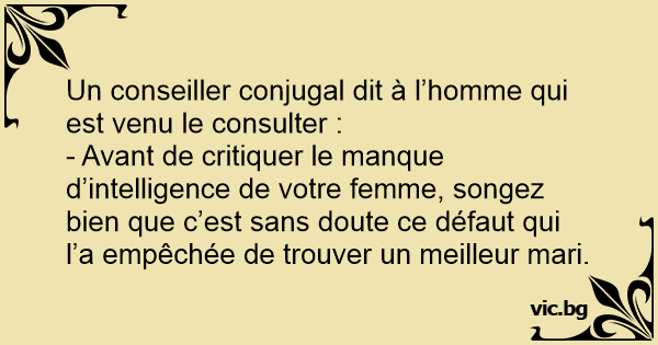 - Avant de critiquer le manque d’intelligence de votre femme, songez bien que c’est sans doute ce défaut qui l’a empêchée de trouver un meilleur mari.