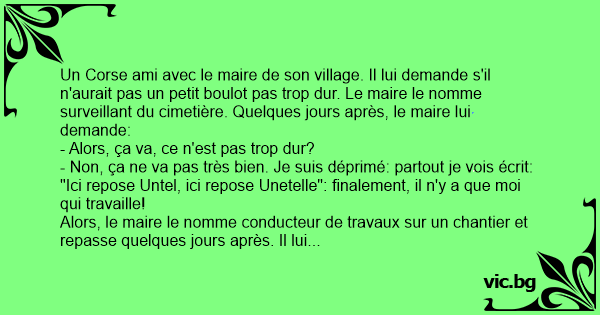 Un Corse ami avec le maire de son village. Il lui demande s'il n'aurait pas un petit boulot pas trop dur. Le maire le nomme surveillant du cimetière. Quelques jours après, le maire lui demande: