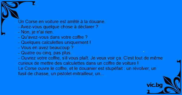 Un Corse en voiture est arrêté à la douane. Le douanier lui demande : - Avez-vous quelque chose à déclarer ? - Non, rien... - Qu'avez-vous dans le coffre ?! - Des calculettes, uniquement... -...