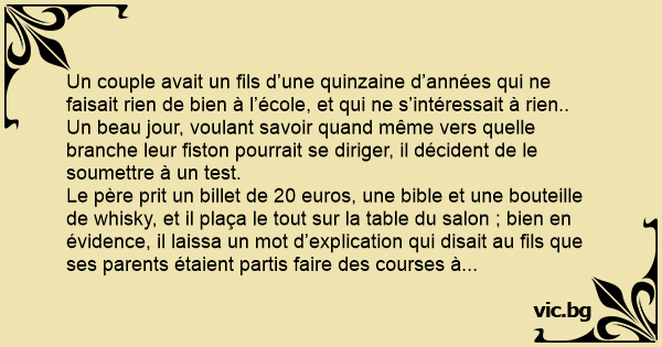 Le père prit un billet de 20 euros, une bible et une bouteille de whisky, et il plaça le tout sur la table du salon ; bien en évidence, il laissa un mot d’explication qui disait au fils que ses parents étaient partis faire des courses à Auchan.