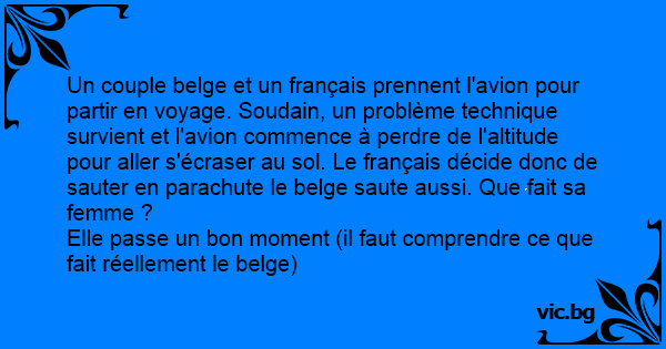 Un couple belge et un français prennent l'avion pour partir en voyage. Soudain, un problème technique survient et l'avion commence à perdre de l'altitude pour aller s'écraser au sol. Le français décide donc de sauter en parachute le belge saute aussi. Que fait sa femme ?