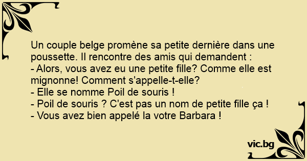 Un couple belge promène sa petite dernière dans une poussette. Il rencontre des amis qui demandent :