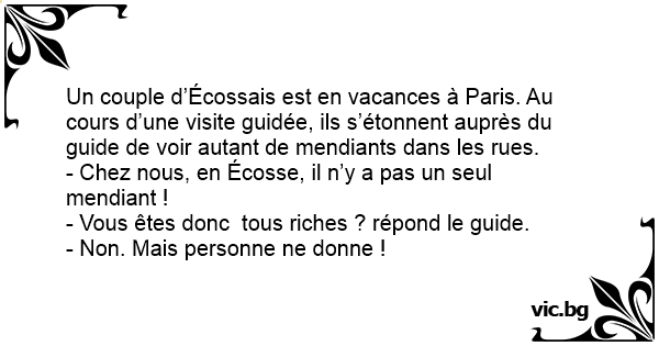 Un couple d’Écossais est en vacances à Paris. Au cours d’une visite guidée, ils s’étonnent auprès du guide de voir autant de mendiants dans les rues.