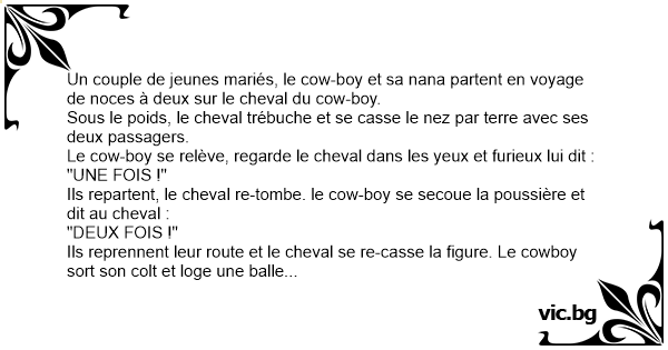 Ils repartent, le cheval re-tombe. le соw-boy se secoue la poussière et dit au cheval :