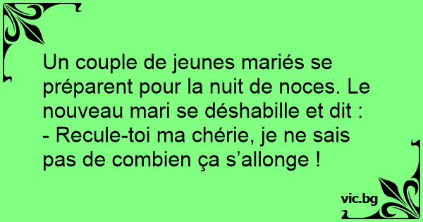 Un couple de jeunes mariés se préparent pour la nuit de noces. Le nouveau mari se déshabille et dit :