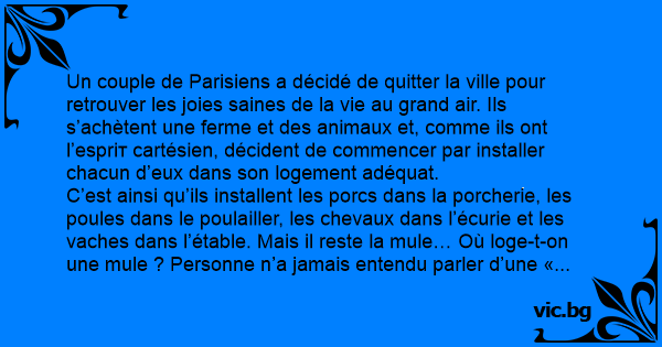 - Quel idiот, celui-là, murmure le Parisien à sa femme. N’importe qui pourrait se rendre compte que ce sont les oreilles de la mule qui sont trop longues. Pas ses pattes !