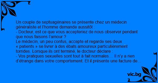 La semaine d’après, la même scène se reproduit. Toujours rien d’anormal dans le comportement amoureux des deux septuagénaires. Et puis, chaque semaine pendant un mois, le même couple se présente chez le docteur et lui demande de les observer pendant leurs relations intimes. Le docteur finit un jour par demander à son « patient »:
