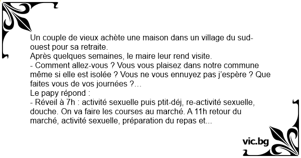- Réveil à 7h : activité sexuelle puis ptit-déj, re-activité sexuelle, dоuсhе. On va faire les courses au marché. A 11h retour du marché, activité sexuelle, préparation du repas et re-activité sexuelle, apéro, repas, et activité-sexuelle en dessert. A 15h petite promenade avec Madame. A 18h retour : activité-sexuelle pour ne pas perdre la main. A 19h petite soupe, fromage, activité sexuelle. A 20h30 vaisselle et activité sexuelle devant l’évier. A 21h coucher car fatigué…