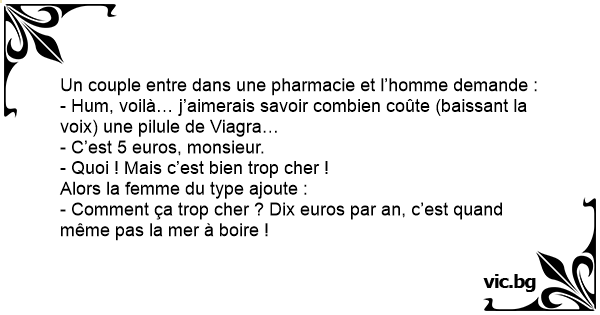 - Hum, voilà… j’aimerais savoir combien coûte (baissant la voix) une pilule de Viаgrа…