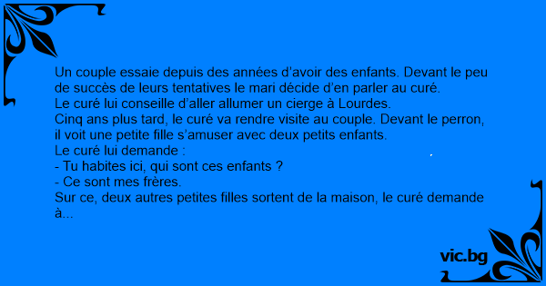 Un couple essaie depuis des années d’avoir des enfants. Devant le peu de succès de leurs tentatives le mari décide d’en parler au curé.