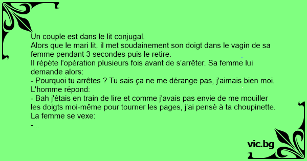 Alors que le mari lit, il met soudainement son doigt dans le vagin de sa femme pendant 3 secondes puis le retire.
