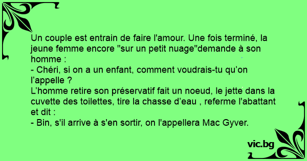 Un couple est entrain de faire l'amour. Une fois terminé, la jeune femme encore "sur un petit nuage"demande à son homme :