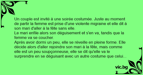 Un couple est invité à une soirée costumée. Juste au moment de partir la femme est prise d'une violente migraine et elle dit à son mari d'aller à la fête sans elle.