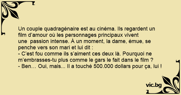 Un couple quadragénaire est au cinéma. Ils regardent un film d’amour où les personnages principaux vivent une passion intense. À un moment, la dame, émue, se penche vers son mari et lui dit :