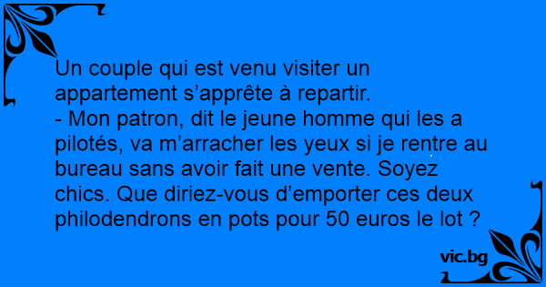 - Mon patron, dit le jeune homme qui les a pilotés, va m’arracher les yeux si je rentre au bureau sans avoir fait une vente. Soyez chics. Que diriez-vous d’emporter ces deux philodendrons en pots pour 50 euros le lot ?