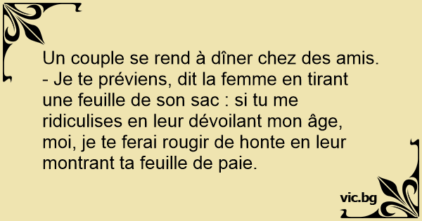 - Je te préviens, dit la femme en tirant une feuille de son sac : si tu me ridiculises en leur dévoilant mon âge, moi, je te ferai rougir de honte en leur montrant ta feuille de paie.