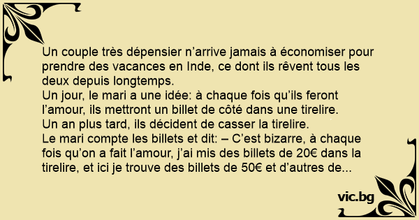 Le mari compte les billets et dit: – C’est bizarre, à chaque fois qu’on a fait l’amour, j’ai mis des billets de 20€ dans la tirelire, et ici je trouve des billets de 50€ et d’autres de 100€…