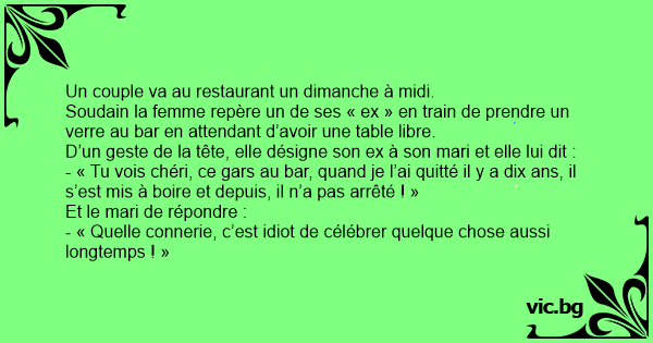 - « Tu vois chéri, ce gars au bar, quand je l’ai quitté il y a dix ans, il s’est mis à boire et depuis, il n’a pas arrêté ! »