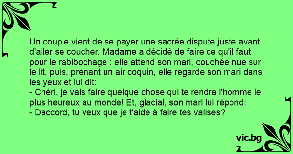 - Chéri, je vais faire quelque chose qui te rendra l'homme le plus heureux au monde! Et, glacial, son mari lui répond: