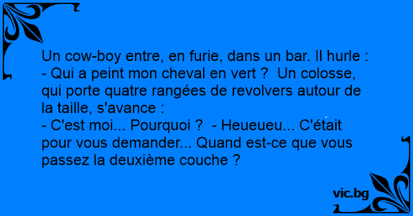 - Qui a peint mon cheval en vert ? Un colosse, qui porte quatre rangées de revolvers autour de la taille, s'avance :