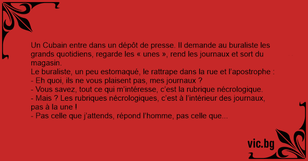 Un Cubain entre dans un dépôt de presse. Il demande au buraliste les grands quotidiens, regarde les « unes », rend les journaux et sort du magasin.