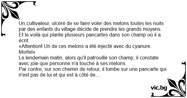 Egy dinnyés gazdát nagyon bosszantja, hogy minden éjjel lopják a dinnyéket a földjéről. Egyik este kitesz egy táblát a dinnyeföld szélére a következő szöveggel: "Figyelem! Van egy dinnye, amelyikbe...
