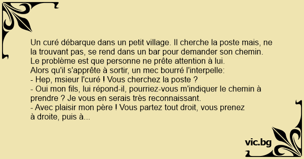 Un curé débarque dans un petit village. Il cherche la poste mais, ne la trouvant pas, se rend dans un bar pour demander son chemin.