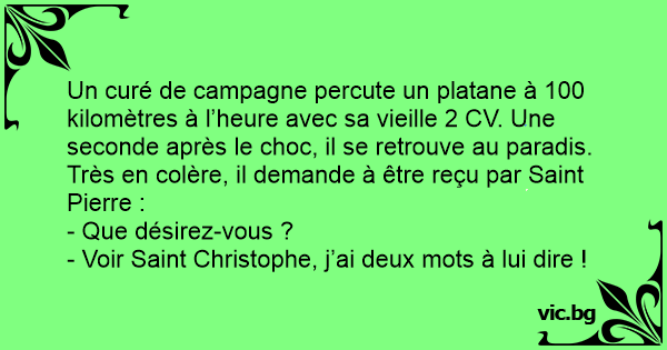 Un curé de campagne percute un platane à 100 kilomètres à l’heure avec sa vieille 2 CV. Une seconde après le choc, il se retrouve au paradis. Très en colère, il demande à être reçu par Sаinт Pierre :