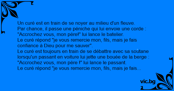 C'est un curé qui est en train de se noyer dans un lac. Les pompiers arrivent et veulent le sauver mais le curé dit "Dieu me sauvera". Donc les pompiers rentre a la caserne mais leur chef les...