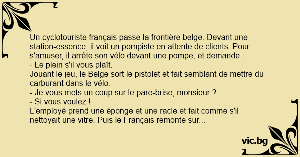 Un cyclotouriste français passe la frontière belge. Devant une station-essence, il voit un pompiste en attente de clients. Pour s'amuser, il arrête son vélo devant une pompe, et demande :