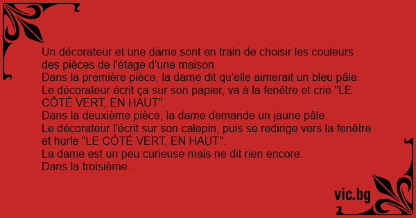 Le décorateur écrit ça sur son papier, va à la fenêtre et crie "LE CÔTÉ VERT, EN HAUT".