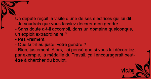 - Rien, justement. Alors, j’ai pensé que si vous lui décerniez, par exemple, la médaille du Travail, ça l’encouragerait peut-être à chercher du boulot.
