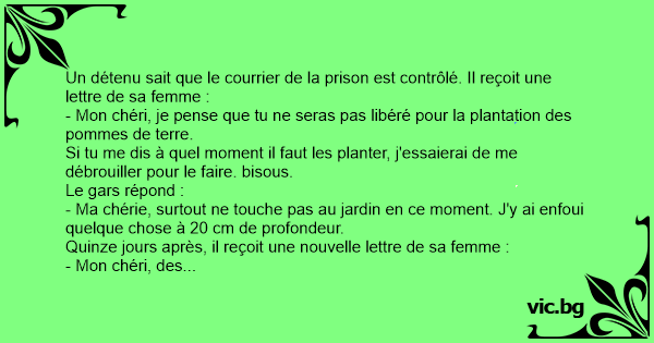 Un détenu sait que le courrier de la prison est contrôlé. Il reçoit une lettre de sa femme :