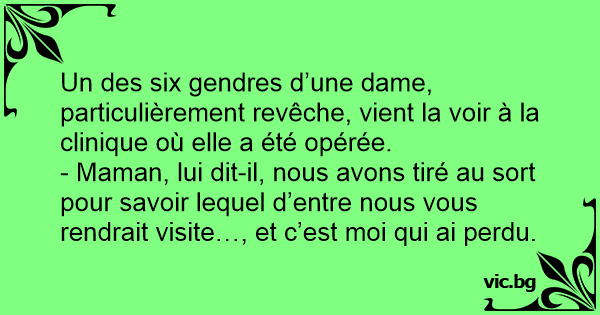 Un des six gendres d’une dame, particulièrement revêche, vient la voir à la clinique où elle a été opérée.