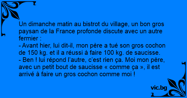 - Ben ! lui répond l’autre, c’est rien ça. Moi mon père, avec un petit bout de saucisse « comme ça », il est arrivé à faire un gros cochon comme moi !