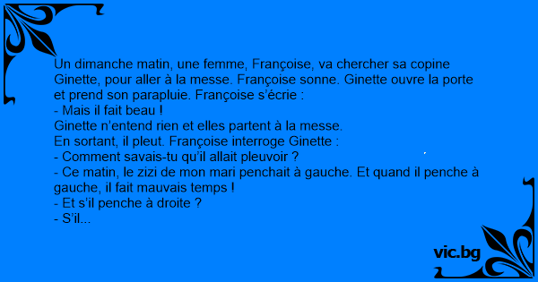 Un dimanche matin, une femme, Françoise, va chercher sa copine Ginette, pour aller à la messe. Françoise sonne. Ginette ouvre la porte et prend son parapluie. Françoise s’écrie :