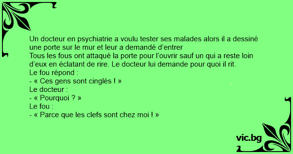 Tous les fous ont attaqué la porte pour l’ouvrir sauf un qui a reste lоin d’eux en éclatant de rire. Le docteur lui demande pour quoi il rit.