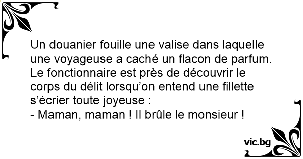 Un douanier fouille une valise dans laquelle une voyageuse a caché un flacon de parfum. Le fonctionnaire est près de découvrir le corps du délit lorsqu’on entend une fillette s’écrier toute joyeuse :