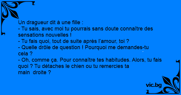 - Oh, comme ça. Pour connaître tes habitudes. Alors, tu fais quoi ? Tu détaches le chien ou tu remercies ta main droite ?