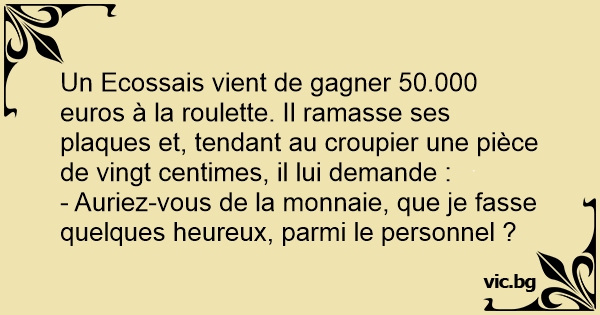 Un Ecossais vient de gagner 50.000 euros à la roulette. Il ramasse ses plaques et, tendant au croupier une pièce de vingt centimes, il lui demande :