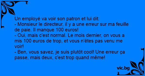- Monsieur le directeur, il y a une erreur sur ma feuille de paie. Il manque 100 euros!