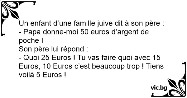- Quoi 25 Euros ! Tu vas faire quoi avec 15 Euros, 10 Euros c’est beaucoup trop ! Tiens voilà 5 Euros !