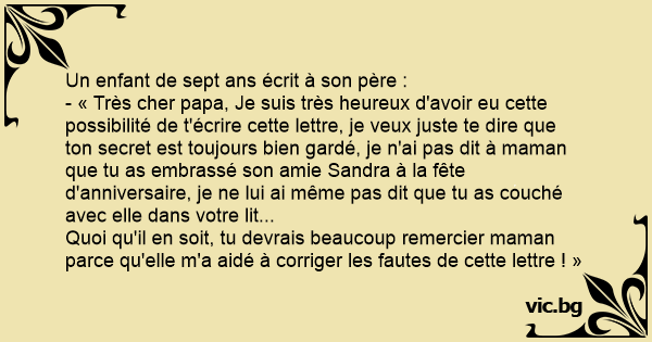 - « Très cher papa, Je suis très heureux d'avoir eu cette possibilité de t'écrire cette lettre, je veux juste te dire que ton secret est toujours bien gardé, je n'ai pas dit à maman que tu as embrassé son amie Sandra à la fête d'anniversaire, je ne lui ai même pas dit que tu as couché avec elle dans votre lit...