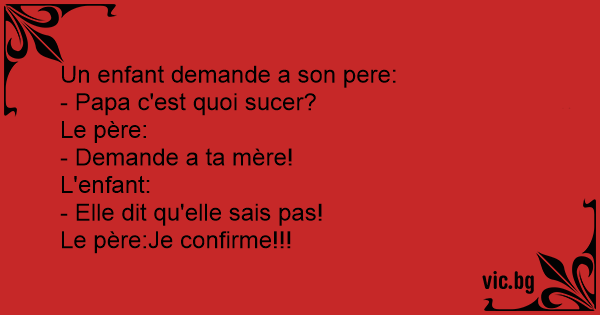 - Papa papa ! Cela veut dire quoi sucer ? - Demande à ta mère. - Elle a dit qu'elle ne savaient pas - Je confirme !
