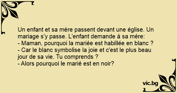 1 mère et 1 fils parle: Fils: Maman pourquoi la mariée porte une robe blanche le jour du mariage? Mère: Car c'est le plus beau jour de sa vie. Fils: Alors pourquoi le marié est habillé en noir?