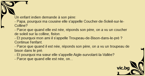 - Papa, pourquoi ma cousine elle s'appelle Coucher-de-Soleil-sur-le-Colline?