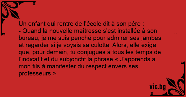 - Quand la nouvelle maîtresse s’est installée à son bureau, je me suis penché pour admirer ses jambes et regarder si je voyais sa culotte. Alors, elle exige que, pour demain, tu conjugues à tous les temps de l’indicatif et du subjonctif la phrase « J’apprends à mon fils à manifester du respect envers ses professeurs ».