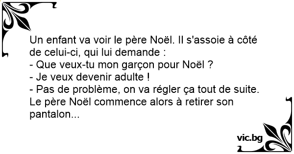 Un enfant va voir le père Noël. Il s'assoie à côté de celui-ci, qui lui demande :